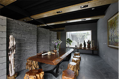 我們知道講究著奢華大器的空間往往喜歡使用天然石材做裝飾,天然石的顏色與花紋向來是其他建材無可比擬,且為模仿的對象,包括磁磚、壁紙等都會取材自石材的色澤與外觀,甚至有仿石板材的形成。不論花崗岩、木化石、竹化石、大理石,甚至是小石子、石粉加工製造而成的人造石,僅管因為形成的原因不同,卻都是上天賦予人類的寶藏,令人愛不釋手;而石材的耐久性更是其他建材無可取代的,因此,總監張鳳玲才會進入此一領域二十多年都還愛不釋手,在大廳展示設計成一個滿足多功能用途的展式空間,一批在火山爆發時,被熔岩掩埋的樹木,經過上億年演化,以木化石、竹化石形托現,在久泰用心的搜羅之下,目前正在會館展出,其可搭配不同材料設計創造出一個引領時尚潮流的空間效果,運用原始粗曠的材料、未加工染色的松木、粗燥的岩石塊體、空心磚給人自然生活的氣息。